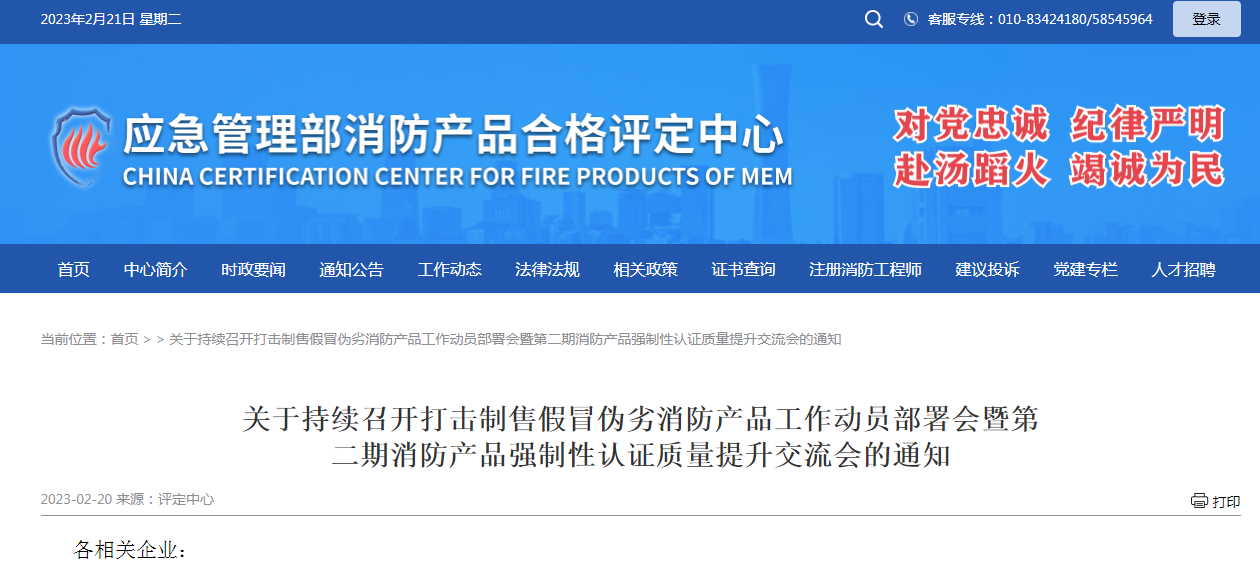 關(guān)于持續(xù)召開打擊制售假冒偽劣消防產(chǎn)品工作動員部署會暨第二期消防產(chǎn)品強(qiáng)制性認(rèn)證質(zhì)量提升交流會的通知