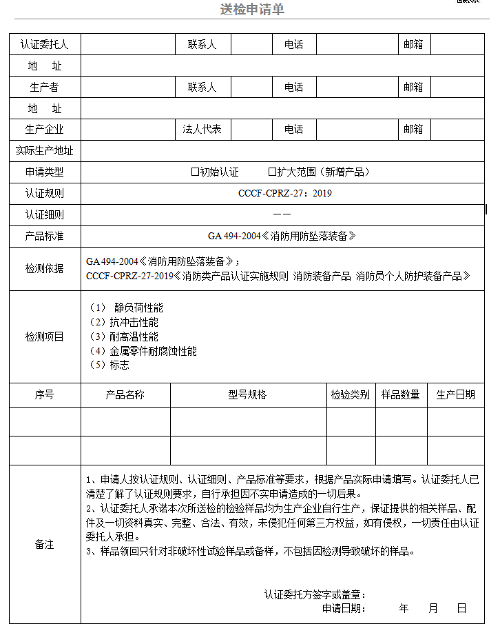 安全腰帶送檢申請(qǐng)單(廣東所)