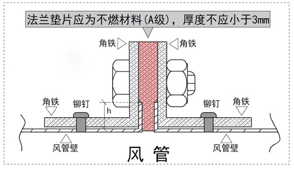 排煙風管的其他要求,通??梢园凑諏嶋H承壓系統(tǒng)確定,比如:螺栓和鉚釘的間距可按中壓系統(tǒng)確定,排煙系統(tǒng)的金屬風管仍可以采用薄鋼板法蘭的連接方式等,從《防排煙技術標準》第6.3.3條規(guī)定“排煙風管應按中壓系統(tǒng)風管的規(guī)定執(zhí)行”就可以看出。