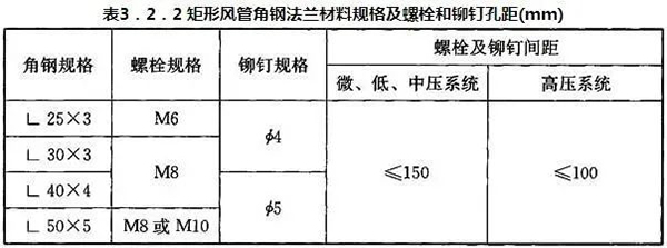 ?。?)風管采用法蘭連接時,風管法蘭材料規(guī)格應按本標準表6.3.1選用,其螺栓孔的間距不得大于150mm,矩形風管法蘭四角處應設有螺孔;