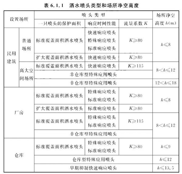 6.1.1設(shè)置閉式系統(tǒng)的場所,灑水噴頭類型和場所的最大凈空高度應(yīng)符合表6.1.1的規(guī)定;僅用于保護(hù)室內(nèi)鋼屋架等建筑構(gòu)件的灑水噴頭和設(shè)置貨架內(nèi)置灑水噴頭的場所,可不受此表規(guī)定的限制。