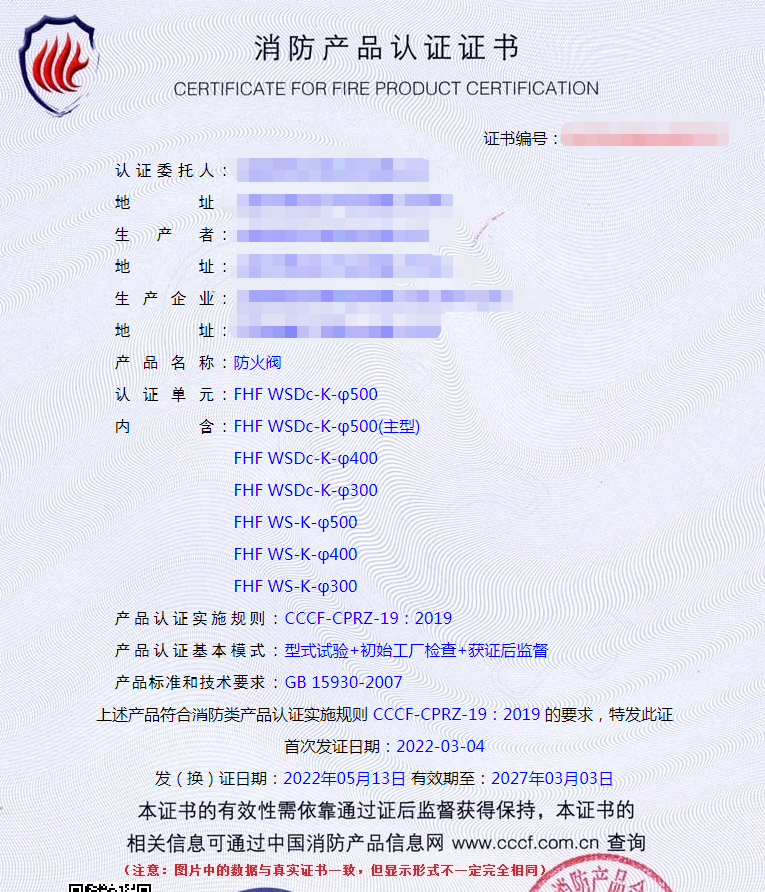 防火閥3C認(rèn)證,產(chǎn)品標(biāo)準(zhǔn)和技術(shù)要求:GB 15930-2007 ,產(chǎn)品認(rèn)證實(shí)施規(guī)則:CCCF-CPRZ-19:2019 。其認(rèn)證證書(shū)樣式如下圖(證書(shū)有效期5年,到期后另再延續(xù)):