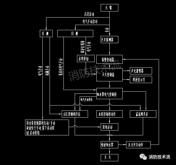 ?。?)自動控制:防護區(qū)內一路探測器報警后,滅火控制器發(fā)出聲光警報信號,當兩路探測器報警確認火災后,滅火控制器驅動防護區(qū)內外的聲光警報器,經30s延時發(fā)出滅火指令至細水霧裝置控制柜打開對應區(qū)域的分區(qū)控制閥,并發(fā)出啟泵信號至水泵控制柜,啟動系統(tǒng)實施滅火。壓力開關動作后,反饋動作信號滅火控制器聯動點亮防護區(qū)入口處的噴放指示燈。開式系統(tǒng)的響應時間不應大于45s。